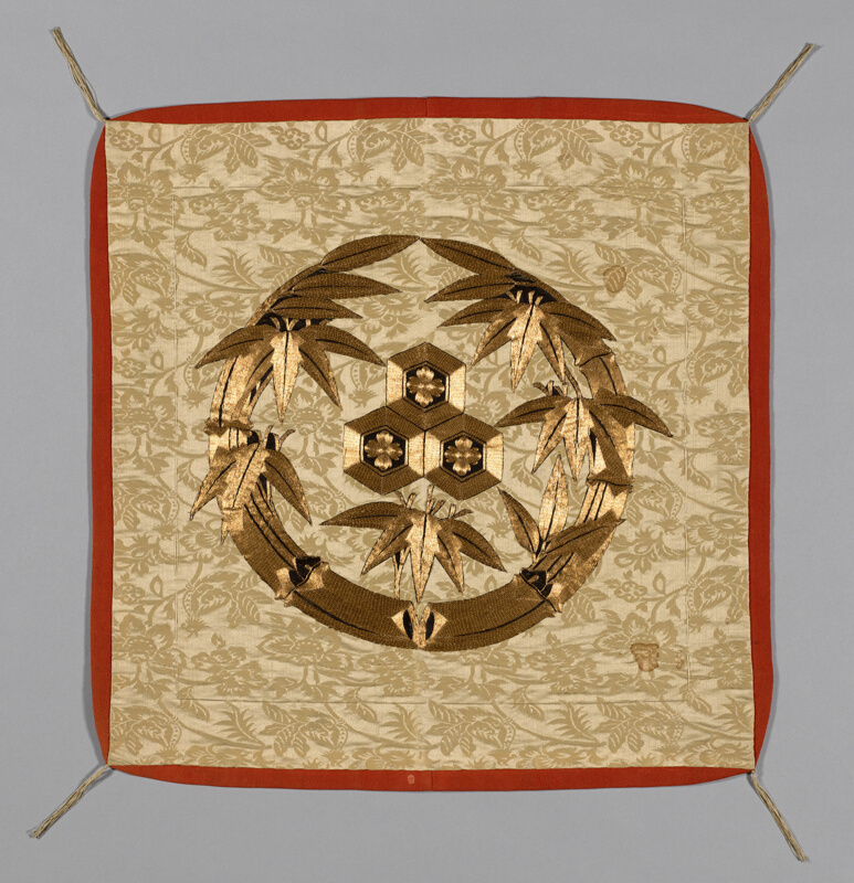 Patterned side: silk, warp-float faced 7:1 satin weave self-pattered by areas of weft-float faced 1:3 ‘Z’ twill interlacings; appliquéd with silk and gold-leaf-over-lacquered-paper-strip wrapped silk in surface satin stitches; laid work and couching; lined with silk, plain weave with creped wefts (chirimen) (possibly dyed with safflower (beni); interlined with cotton, plain weave; sewn with padded lining extending beyond front at center on all four sides (Yatsuzuma); silk, running “controlling” stitches along all edges; silk, knotted, cut fringe tassels